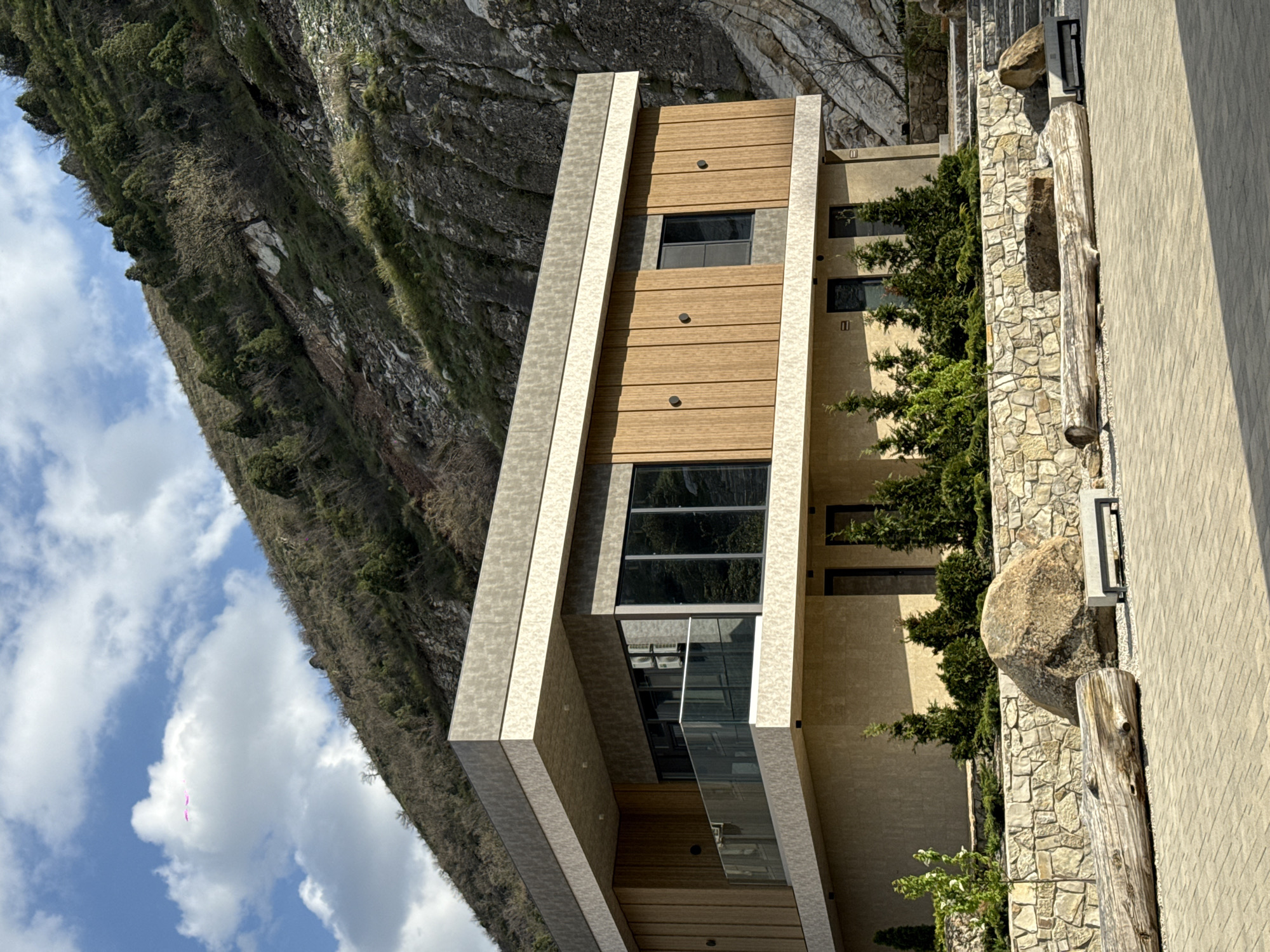 The image depicts a modern building, possibly a residence, located in Novo-Zubutli, Russia. The building features a combination of materials including wood paneling, stone, and glass. Its architecture is characterized by clean lines and a geometric design. The building is situated near a steep, rocky hillside. The sky is visible with scattered clouds. Stone and wood exterior design elements are added.