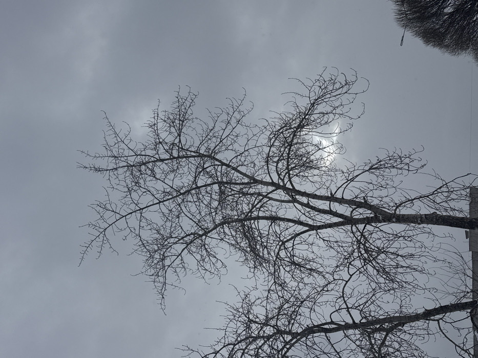 The image displays a winter scene in Chernushka, Russia, characterized by an overcast, gray sky. Two prominent deciduous trees, entirely bare of leaves, dominate the foreground with their intricate branch networks silhouetted against the muted sky. A diffused, bright light source, presumably the sun, is faintly visible behind the clouds in the upper-right quadrant. The lower edge of a light-colored building is partially discernible at the bottom center, while the top of a street lamp is visible in the lower-right corner, adjacent to smaller, leafless trees or shrubs. No individuals or active interactions are depicted within the frame.