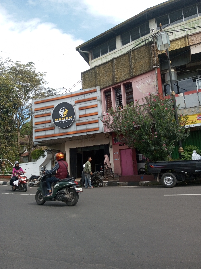 An overhead-lighted street scene in the city of Chagzam_Pam, Bhutan, captures a daytime view of a commercial street lined with multi-story buildings. In the mid-ground, a "SASAK GYM" sign, featuring a black circular logo with a white figure, is prominently displayed on a building with white and orange horizontally paneled facade. To the right, an adjacent building presents a worn pink facade with barred windows and a pink door, above which a textured brown section and upper windows are visible. The asphalt road in the foreground shows a dark green scooter driven by an individual wearing a red vest and orange helmet, moving from left to right. Further left, a second person on a red scooter, wearing a pink top and white helmet, travels in the same direction. On the sidewalk in front of the SASAK GYM entrance, two individuals stand; one male in a green jacket and jeans, and one female in a patterned hijab and long dress. A black pickup truck with an open bed is parked on the far right, near the curb, with a person in white attire partially visible near its rear. Several other scooters are parked on the sidewalk near the gym entrance. Green trees with dense foliage line the left side of the street, while a flowering shrub with pink blooms grows in front of the pink building. A street lamp pole with multiple arms and a white lantern-style fixture stands on the right sidewalk. Electrical wiring is visible above the buildings.