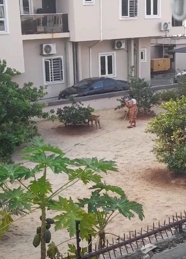The video depicts a woman and a dog in a sandy yard outside a multi-story building. The woman, wearing a patterned dress, is standing in the yard facing a small, tan dog that is near a shrub. She appears to be gesturing or talking to the dog. The yard is sandy with scattered shrubs and a small papaya tree in the foreground, partially obscured by a metal fence. Behind the yard is a light-colored building with multiple windows, air conditioning units, and a balcony. A black car is parked in front of the building. In the background, a yellow generator is visible. The video is taken from an elevated position.