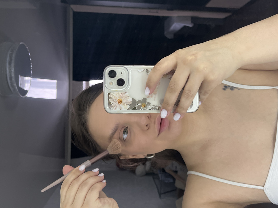 A young adult female is depicted taking a mirror selfie indoors, presumably within the city of Chaikovsky, Russia. Her left hand, adorned with white-painted fingernails, holds a light brown makeup brush with beige bristles, positioned to apply product to her right eyebrow. Her right hand, also with white-painted fingernails, holds a white iPhone with a clear, floral-patterned case (featuring white and pale yellow flowers), capturing the reflection. She is wearing a white spaghetti strap top, and a small, dark tattoo resembling flowers or a branch is visible on her upper right shoulder. A silver hoop earring is visible in her left ear. Her gaze is directed slightly to her left. The background reflection reveals a dark wall or curtain, a faint light-colored object (potentially furniture covered with white fabric) further back, and a circular ceiling light fixture with an additional rectangular light source reflected above.