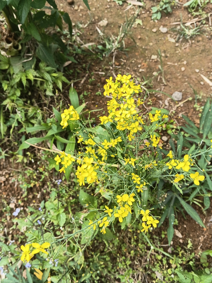 The image displays a ground-level view of a cluster of small yellow flowers with green stems and leaves, located in Pacet, Indonesia. The central subject is a plant bearing numerous bright yellow, four-petaled blossoms. The surrounding environment consists of reddish-brown soil, sparse green foliage, and small scattered stones. Denser green vegetation is visible towards the left side of the frame, while the upper right features more exposed soil with minimal plant growth. No individuals or animals are present. The scene is illuminated by natural, diffused light.