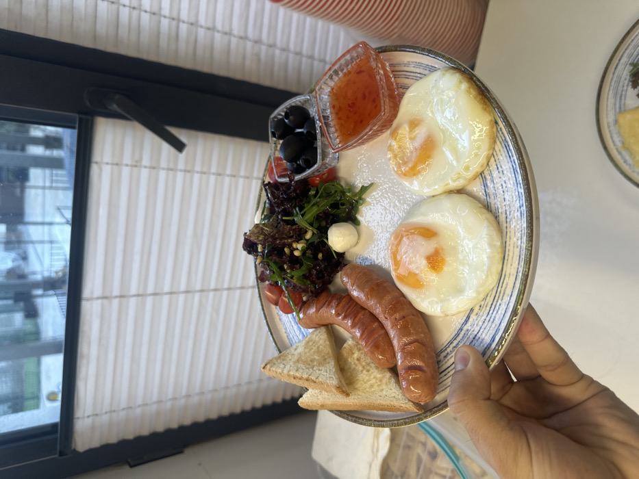 - "A plate of breakfast is being held, containing two fried eggs, two sausages, two slices of toast, a small salad with cherry tomatoes and mozzarella balls, a small dish of olives, and a small dish of sauce" by FM-ciE9C3, licensed under CC BY 4.0