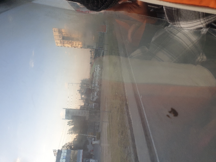 A blurry, upward-angled shot depicts a roadside scene through a vehicle window. Buildings of varying heights line the road, including a notable billboard. Vehicles are parked along the side of the street. The sky is light, suggesting it is either early morning or late afternoon. The window's surface has a few smudges. The upper portion of the image captures part of the vehicle's interior, specifically a person dressed in casual wear.