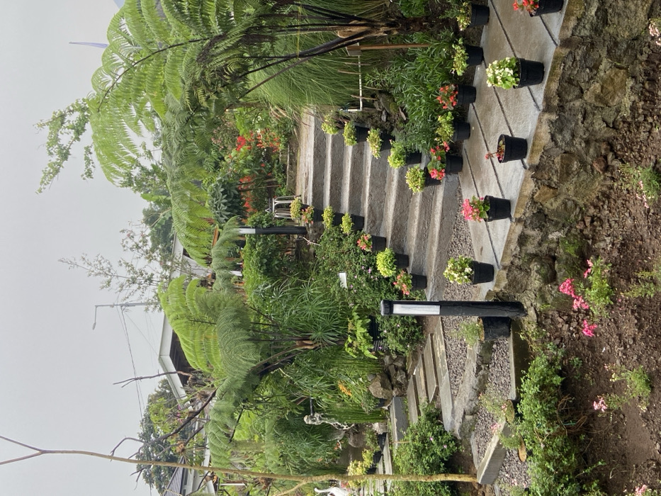 Concrete steps ascend through a lush garden. Black flower pots line the stairs, filled with colorful blooms. Ferns and other greenery thrive along the sides. A black light post is visible, positioned between the stairs and a gravel path. Rocky terrain borders the garden. The sky is overcast.