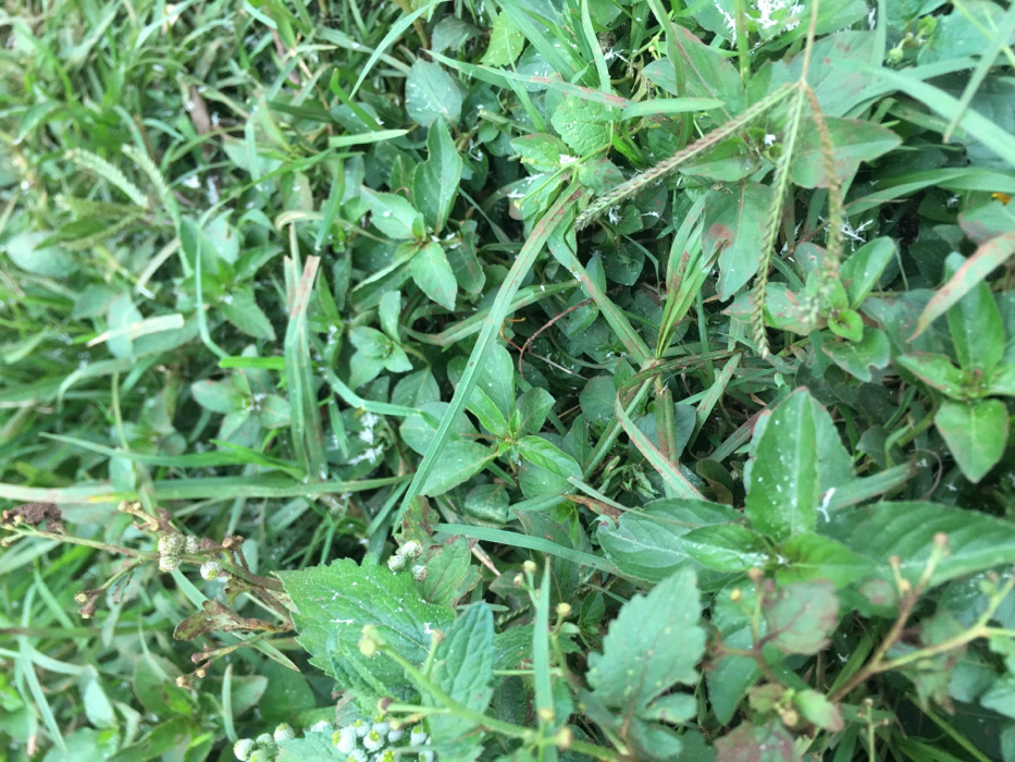 The image displays a close-up, ground-level view of a dense patch of green vegetation located in Bobaracho ward, Kenya. The scene is dominated by a variety of mixed plant types, including broad-leafed plants and slender grass blades. Several leaves, particularly the broader ones, show scattered white particulate matter or residue on their surfaces. Small, light-colored, spherical buds or pre-flowering structures are visible on some of the plants, notably in the lower and upper left quadrants. Evidence of dried or browning plant material is interspersed among the green growth. No human subjects, objects, or actions are depicted; the scene is purely environmental, consistent with natural, untended ground cover.