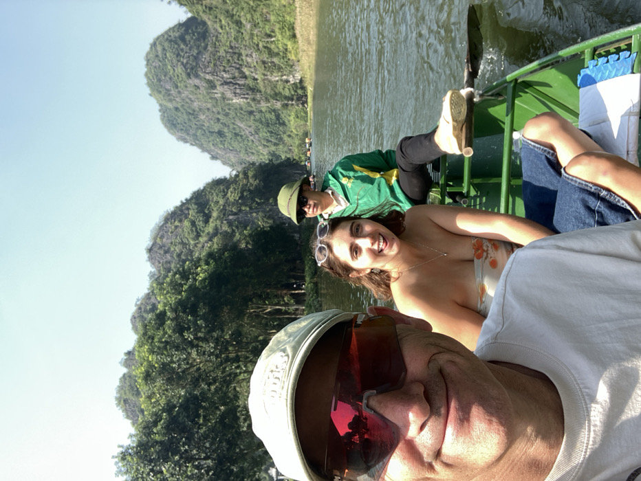 Three people are in a boat on a river surrounded by lush green mountains. The person in the foreground is taking a selfie, wearing a white shirt, hat, and red-tinted sunglasses. Behind them is a woman smiling in a floral top, and a person in a green shirt and hat is steering the boat. The water is calm, and the sky is clear, suggesting a sunny day. The boat appears to be a simple, open-air vessel.