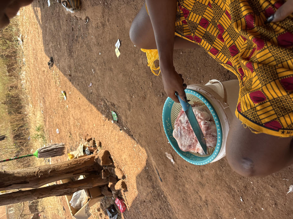 - "An outdoor, high-angle shot in Oturkpo, Nigeria, depicts a person seated or squatting on dry, reddish-brown earth, engaged in meat preparation" by FM-zrXr72, licensed under CC BY 4.0