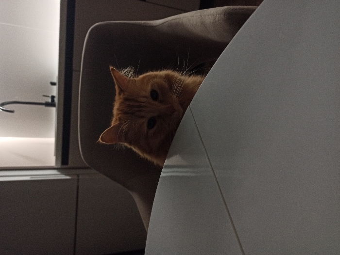 An orange tabby cat peers out from behind a curved, white surface, partially obscured. The cat has green eyes and a curious expression. It sits in a gray chair. In the background, a sink and countertop are visible against a pale wall. The scene is dimly lit, adding to the mysterious and playful nature of the cat's appearance.