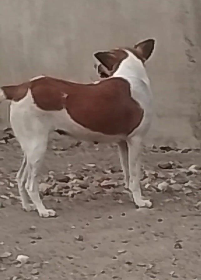 medium-sized dog standing on a dirt and gravel surface. The dog has a white coat with large brown patches on its back and head. The dog is facing slightly to the right of the frame and looking towards the camera. There is a blurry, light gray wall in the background. Someone is speaking, saying "See dog" twice.