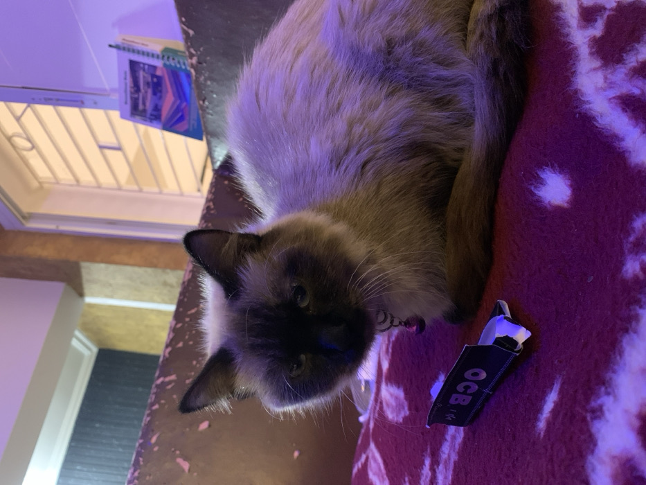 A Siamese cat lies on a maroon and white patterned blanket. The cat has a dark face, ears, and tail, with a lighter body. A black tag labeled "OCB" is visible next to the cat. In the background, there is a gate with a notebook hanging on it. The room is illuminated with a purple light.