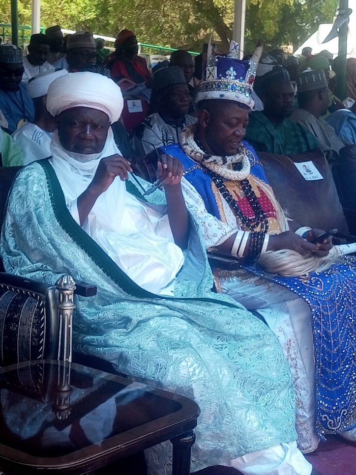 This image captures an outdoor public event in Kokani North, Nigeria, featuring two prominent male figures seated in the foreground