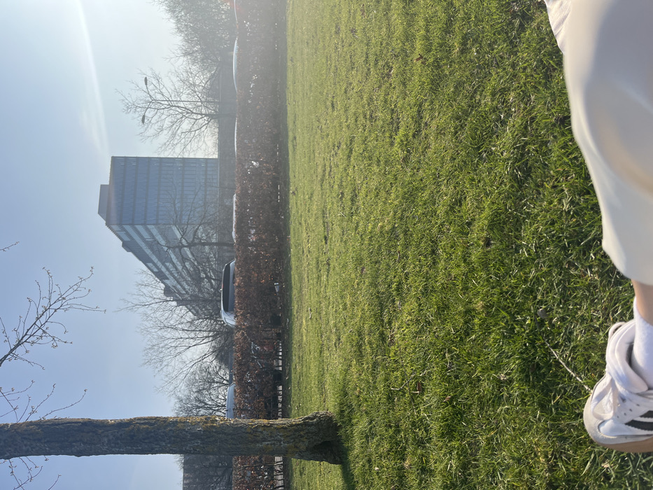 The scene is an outdoor, daytime view, captured from a low angle across a green lawn. In the immediate foreground, the lower legs and feet of an individual are partially visible, clad in light-colored trousers or skirt and white Adidas sneakers with black stripes, indicating the person is seated on the ground. The majority of the lower and central frame is occupied by a vibrant green, neatly mown lawn with minimal brown foliage. A tree with a rough, brown trunk stands vertically on the left side of the frame, its bare branches extending upwards. Beyond the lawn, a dense, reddish-brown hedge forms a horizontal barrier. Several vehicles, including at least one white SUV, are partially visible behind this hedge, suggesting a road or parking area. Numerous bare-branched deciduous trees are scattered behind the hedge and the foreground tree. On the right, a dark street light post with two luminaires is visible. The background is dominated by a large, modern, multi-story building with a reflective blue-tinted glass facade, characteristic of corporate architecture. This structure is identified as a section of the Philips High Tech Campus 5 / The Strip complex, located at High Tech Campus Eindhoven, Netherlands. The sky above is clear and bright blue, with significant lens flare originating from the upper right quadrant, indicating strong direct sunlight.