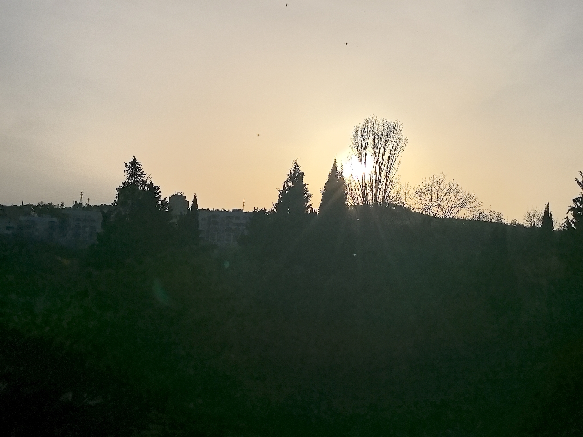 The image captures a landscape at sunset, possibly taken near Stara Zagora, Bulgaria. The sun is partially obscured by trees on a distant hill, casting a golden hue across the sky. Silhouetted against the bright sky are various evergreen trees and deciduous trees, some with bare branches. In the background, a cityscape can be seen, with buildings appearing as dark shapes. The foreground is dark, likely indicating that the photograph was taken from a lower vantage point with foreground shadows. Several small objects are flying in the sky, most likely birds or insects.