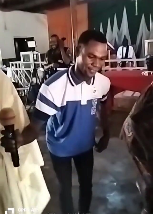 A man in a blue and white striped polo shirt and black pants is holding a microphone and singing in what appears to be a church. He’s smiling and looks like he's enjoying himself. Other people are around him and behind him is what looks like a music band. Further back on a raised platform, a person in white robes is visible. There's a Christian cross visible in the background. The room appears to be simply decorated. A timestamp in the corner of the screen indicates that the video was recorded on 17 January 2026.