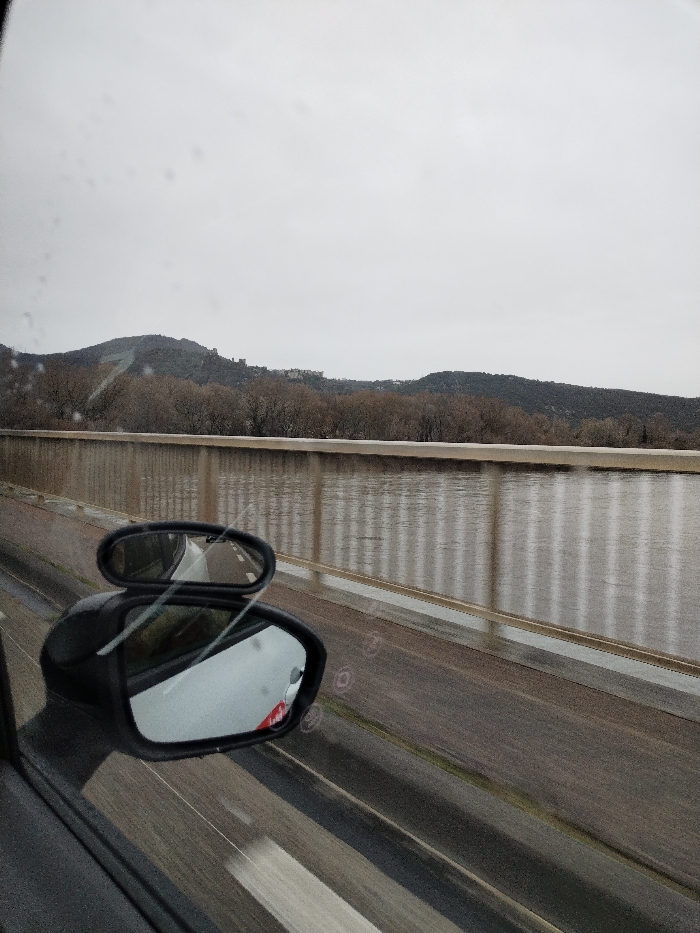 The image depicts a scene observed from inside a moving vehicle on an overcast day, looking across a body of water towards Rochemaure, France