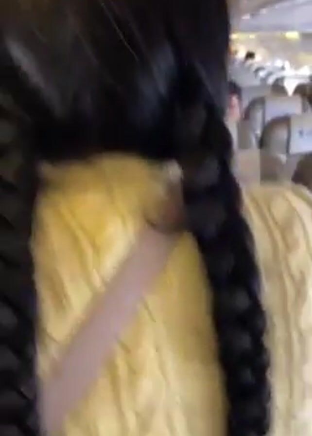 interior of an airplane, focusing on the aisle packed with passengers standing and moving forward. The initial shot focuses on a person with long braids and a yellow sweater. The camera then moves to follow the flow of people through the aisle. Overhead bins appear to be full. The seats are upholstered with blue fabric featuring the logo of "ecoJet." Some passengers are seated. The overall impression is of a crowded airplane during boarding or disembarkation.