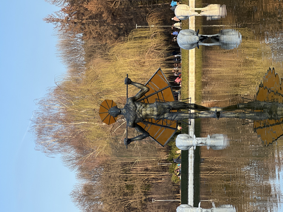 The image depicts an outdoor park scene in Sofia, Bulgaria, specifically within Borisova Gradina, featuring a large pond. Centrally, a dark, possibly bronze, male humanoid statue stands upright in the water, with its feet submerged. The statue holds a horizontal bar across its shoulders and is adorned with a segmented yellow-orange circular headpiece and two angular, wing-like structures of matching color extending from its back. Several white, sheep-like statues are also partially submerged in the pond, positioned as if drinking. The pond's surface is rippled and reflects the clear blue sky and warm, light-colored trees in the background. The background consists of a dense arrangement of deciduous trees, some bare and some exhibiting early spring foliage, interspersed with darker evergreen trees. Distantly, multiple small groups of individuals are visible on the grassy banks and pathways around the pond, indistinctly sitting or standing. The scene is illuminated by natural sunlight, casting warm tones on the vegetation and reflections in the water.