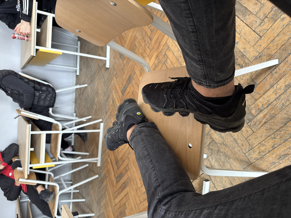 The image displays a classroom scene in Plovdiv, Bulgaria. In the immediate foreground, a person's lower legs are visible, extended and resting with feet propped on a light-colored wooden chair seat. The individual wears faded black jeans and black Nike Vapormax Plus sneakers, which feature distinct black rubber pods on the soles. The flooring is a worn wooden parquet arranged in a herringbone pattern. In the midground, several individuals are seated at light-colored wooden desks with white metal frames. To the left, one person wears a black jacket over a red hoodie, and another is clad in a black puffer vest over a dark long-sleeved shirt. To the right, another person is seated, wearing a dark long-sleeved shirt with an "ellesse" logo visible on the right sleeve, and a red and white Coca-Cola can rests on their desk. The background consists of a plain light grey wall.