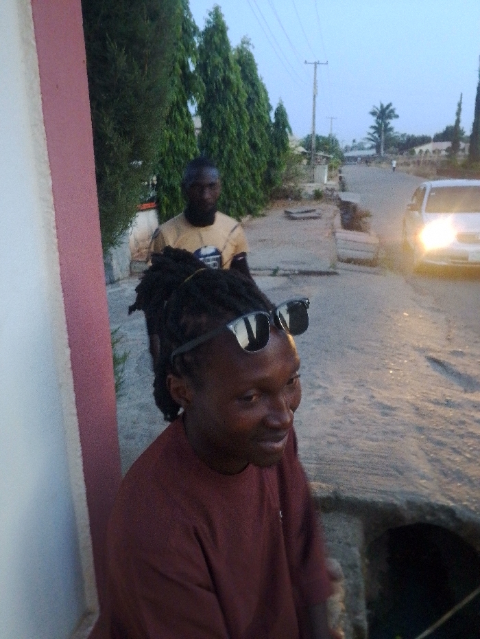 Two men stand near a street. The man in the foreground wears sunglasses on his head and a dark red shirt. The other man stands behind him, wearing a light-colored shirt with a design. A white car with its headlights on is visible on the street. Trees line the road, and a utility pole stands in the distance. The sky is a pale blue, suggesting dusk or early morning.
