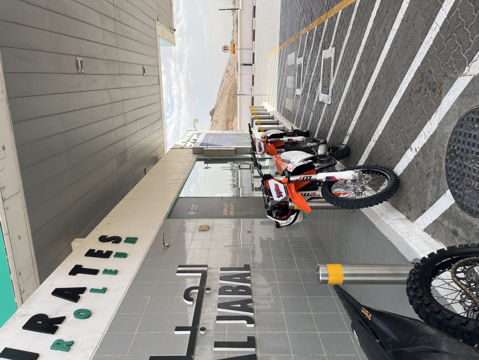 A line of orange and white dirt bikes is parked outside a building with “EMIRATES” and “AL JABAL” inscribed on its facade. The building appears to be near a mountain and a parking zone marked with white stripes. A manhole cover is visible on the right side of the image. The sky is overcast.