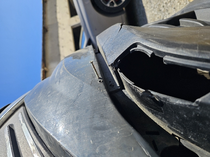 The scene depicts a damaged vehicle component outdoors in Blagoevgrad, Bulgaria. A close-up, low-angle perspective shows a dark grey, textured plastic section, consistent with a vehicle's fender liner or bumper trim, exhibiting signs of wear and dirt accumulation. A silver metal self-tapping screw is partially driven into the upper portion of the plastic, protruding horizontally outward from a circular penetration point. Below the screw, the plastic component is severely fractured and detached, forming an irregular opening with jagged edges that reveals an internal void. The background features a partial view of a light grey vehicle, displaying a wheel with a red hub or rim accent, positioned in front of a light-toned, possibly industrial, building with multiple rectangular apertures. Above, a clear blue sky indicates daytime conditions with bright, direct sunlight. No individuals are present.