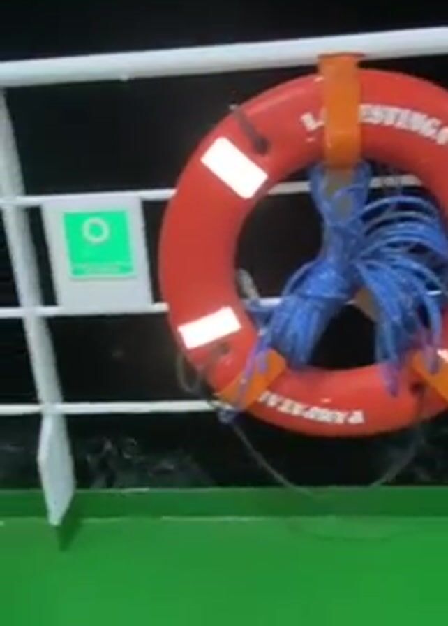 ship railing. Attached to the railing is a bright red life preserver with reflective white strips, labelled "LA RESTINGA" and "PAMPATAR" with "ARSH-PJ-0017" printed below. A coiled blue rope is attached to the preserver. The railing is white and the deck of the ship is bright green. A green emergency exit sign is attached to the railing. The video pans towards the dark ocean. The water is visible between the railings.