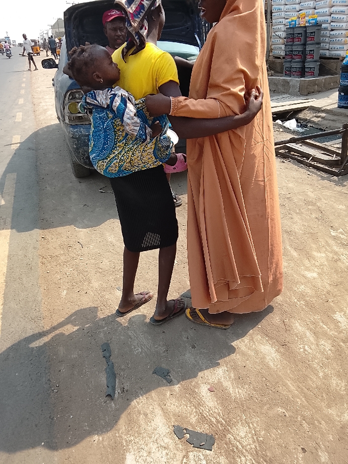The scene is set outdoors in Masaka, Nigeria, under direct sunlight, indicated by pronounced shadows on the ground. In the immediate foreground, two individuals, identified as women, stand close together, each with an arm wrapped around the other's waist. The woman on the left, wearing a black pleated skirt and brown flip-flops, carries a young child securely fastened to her back in a blue, yellow, and white patterned fabric sling. The child has braided hair and pink slippers. The woman on the right wears a long, light brown garment and yellow and black flip-flops. Behind them, slightly to the left, a male individual in a red cap and a yellow short-sleeved t-shirt stands near the open trunk of a dark-colored vehicle. To the right, in the background, stacks of white sacks, some marked "P.O.P," and black cylindrical containers are visible, suggesting a commercial establishment. A road surface, a mix of dirt and cracked asphalt, extends into the background where blurred human figures, motorcycles, and other vehicles are present. The sky is clear.