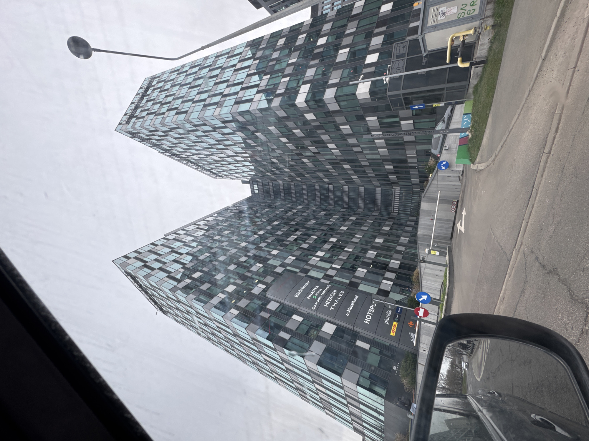 This image depicts the Globalworth Plaza office complex, located at Barbu Văcărescu Street 201, Bucharest, Romania. The scene is viewed from inside a vehicle, with the top edge of the windshield visible across the top of the frame and the vehicle's left side mirror occupying the lower-left foreground. The central subjects are two modern, multi-story office buildings featuring facades composed of an irregular pattern of dark grey and light blue/grey rectangular glass panels. The name "GLOBALWORTH" is visible near the top of the right building. A large, dark grey vertical sign board stands prominently in front of the left building, listing tenant companies with their logos: Bitdefender, FINASTRA, Solera, OAROABS Koncentrix, HITACHI THALES, MassMutual, HOTSPOT, pluridio, DHL, and Aconex. At ground level, a paved access road leads towards the buildings, where an entrance is controlled by a white barrier arm. Road signage includes a red circular sign indicating "No Entry" and a blue circular sign with a white arrow directing traffic to "Turn Right." A separate blue circular sign with a downward arrow indicates a parking entrance. A dark grey passenger vehicle is observed on a ramp leading into this parking facility. The side mirror reflects a street with a distant white car and bare trees. On the far right, a tall black street lamp post stands next to grey utility boxes adorned with graffiti. Patches of green grass are present along the roadway and at the base of the buildings. The sky is uniformly overcast. No individuals are distinctly visible or identifiable within the scene.