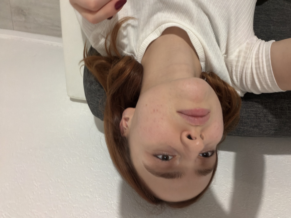 A person with reddish-brown hair wearing a white shirt is looking at the camera, tilted upside down