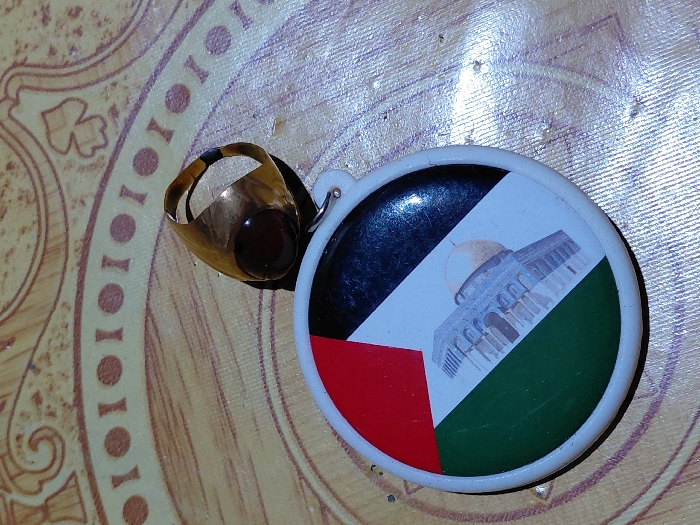 A gold ring with a dark red stone sits next to a circular plastic keychain. The keychain displays an image of the Dome of the Rock over the Palestinian flag. The ring and keychain rest on a surface with a patterned design. The colors appear slightly faded, and the composition includes a close-up perspective.