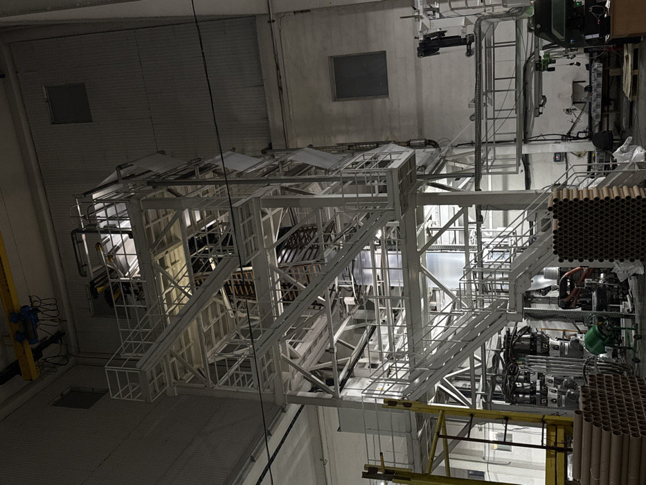 The image depicts the interior of a large industrial facility located in Perm, Russia. The central subject is a towering, multi-level blown film extrusion line, constructed from white painted metal framework, featuring platforms, stairs with railings, and support beams. A translucent, wide plastic film is visible extending vertically through the core of the machinery, suggesting an ongoing manufacturing process. At the top of the facility, a yellow overhead crane rail system with a blue hoist is mounted to the ceiling structure. The walls of the building are light-colored, possibly concrete or metal paneling, with several rectangular windows visible at higher elevations. Various industrial components, including pipes, conduits, and electrical wiring, are integrated into and around the main machinery structure. On the floor level in the foreground, stacks of brown cardboard tubes, commonly used as cores for rolled film products, are present. Other industrial equipment, possibly processing units or control panels, are visible at the base of the main structure. The lighting in the facility appears to be artificial, casting some areas in brighter illumination and others in shadow. No individuals are visible within the scene, and no specific actions or interactions are depicted. The overall environment is one of an active, large-scale manufacturing operation.