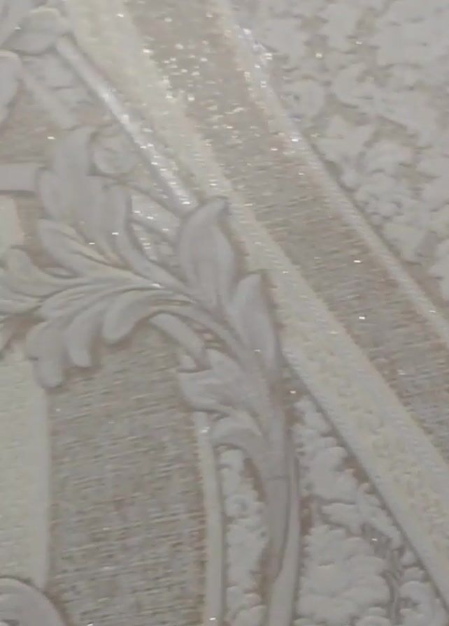 The camera focuses on a section of wallpaper. The wallpaper is light in color, with a pattern of floral and baroque designs. The pattern appears to have a textured or embossed surface. The camera moves slightly, showcasing more of the design, including flower motifs, flowing stripes, and decorative elements. The lighting seems to highlight the texture and details of the wallpaper.