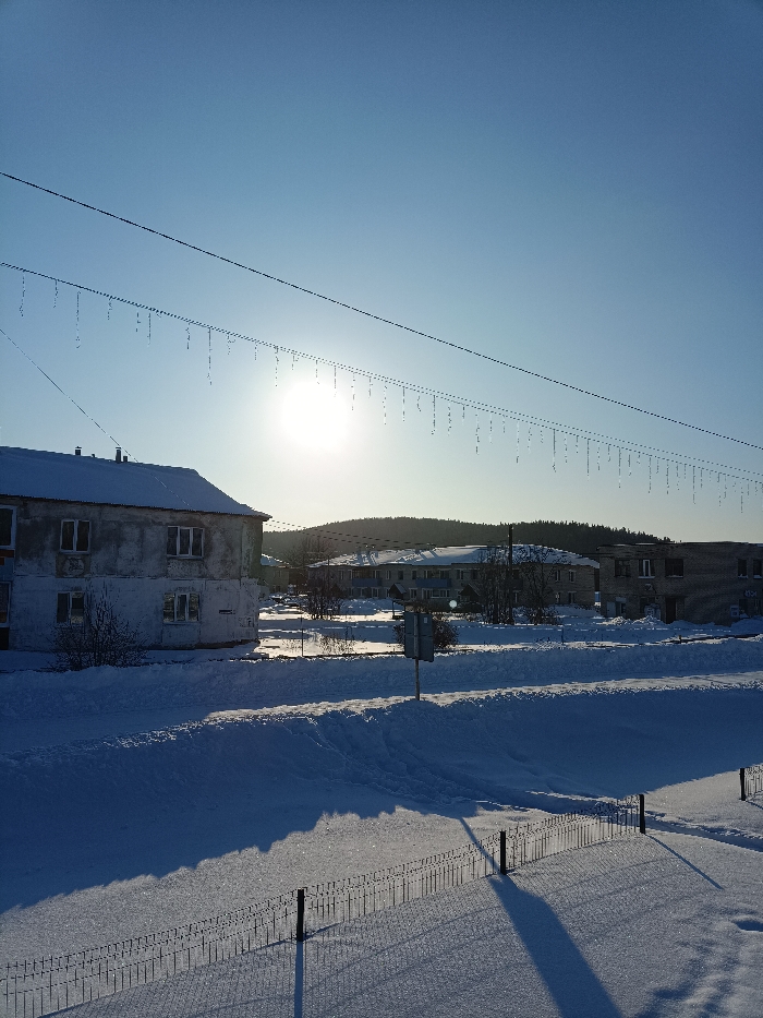 The image depicts a winter scene in the city of Посад, Russia, under clear, bright blue skies with a low-lying sun. The ground is covered in a substantial layer of undisturbed snow, casting long shadows across the terrain, notably from a low, dark-colored mesh fence with vertical posts in the bottom-right foreground. Two parallel horizontal wires, likely utility lines, traverse the upper mid-ground, with numerous individual icicles of varying lengths hanging from the lower wire. In the mid-ground on the left, a two-story building with a snow-covered gabled roof and a light-colored, weathered facade featuring multiple rectangular windows is visible. Further into the mid-ground, on the right, a cluster of additional buildings with snow-covered roofs is present, indicating a developed area. A dark, rectangular signpost or marker stands prominently in the central mid-ground, partially obscured by snow. The background features a rolling, snow-covered hill densely forested with trees, silhouetted against the bright horizon. No individuals are visible, and no discernible actions are occurring.