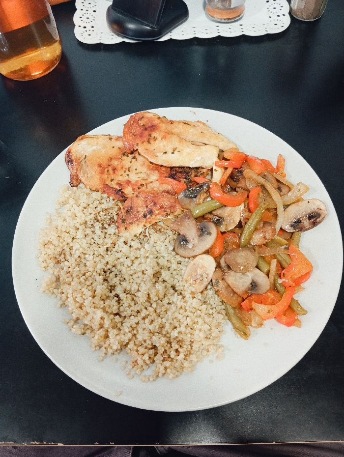 A white, circular plate containing a meal is centrally positioned on a dark, flat surface, likely a table. The plate is divided into three primary components: a portion of cooked quinoa occupying approximately half of the plate, multiple pieces of golden-brown chicken breast with visible seasoning, and a mixture of sautéed vegetables. The vegetables include sliced white mushrooms, red bell pepper strips, green beans, and sliced onions. In the background, on the upper left, a clear glass bottle with amber liquid is partially visible. On the upper right, a white, scalloped paper doily is present, upon which rests a dark, unidentified object and two small spice shakers, one appearing to contain a reddish-brown spice. No individuals are present. The specific location within Ripollet, Spain, cannot be determined from the visual information provided.