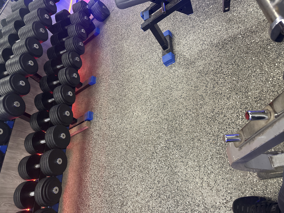 The scene depicts the interior of a gymnasium located in Karlovo, Bulgaria. The image is captured from a low vantage point, appearing to be from a seated or reclined position. Two multi-tiered dumbbell racks are prominently positioned horizontally across the mid-ground and background. These racks hold numerous black dumbbells with silver handles, arranged in order of increasing weight from left to right. Red and blue LED strip lighting illuminates the undersides of the racks, casting a subtle glow on the light grey, speckled floor surface. In the bottom right of the frame, a segment of a black and blue gym apparatus, possibly a weight bench, is visible. In the immediate foreground on the left, a portion of a metallic grey gym machine featuring two upright cylindrical chrome adjusters is present. A black athletic shoe, consistent with a left foot, is partially visible in the bottom left corner, indicating the presence of an individual within the scene.