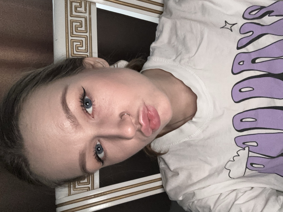 An indoor selfie captures a young adult female from the chest up. She possesses blue eyes, enhanced with winged black eyeliner, and light brown eyebrows. Her lips are pursed in a "kissing" pose. A small silver ring adorns her left nostril, and a small, silver-toned stud earring is visible on her right ear. Her hair is pulled back, partially visible behind her right ear. She is wearing a white short-sleeved t-shirt featuring a graphic of large, rounded, purple letters, which partially spell "BAD DAYS" or similar, accompanied by a cloud design and a star. The background reveals a furniture piece, likely a chair or headboard, characterized by a white frame with gold-colored Greek key patterns. The area behind this furniture is dark brown. The specific location within Krasnodar, Russia, cannot be determined from the provided internal imagery, which depicts a generic residential interior.