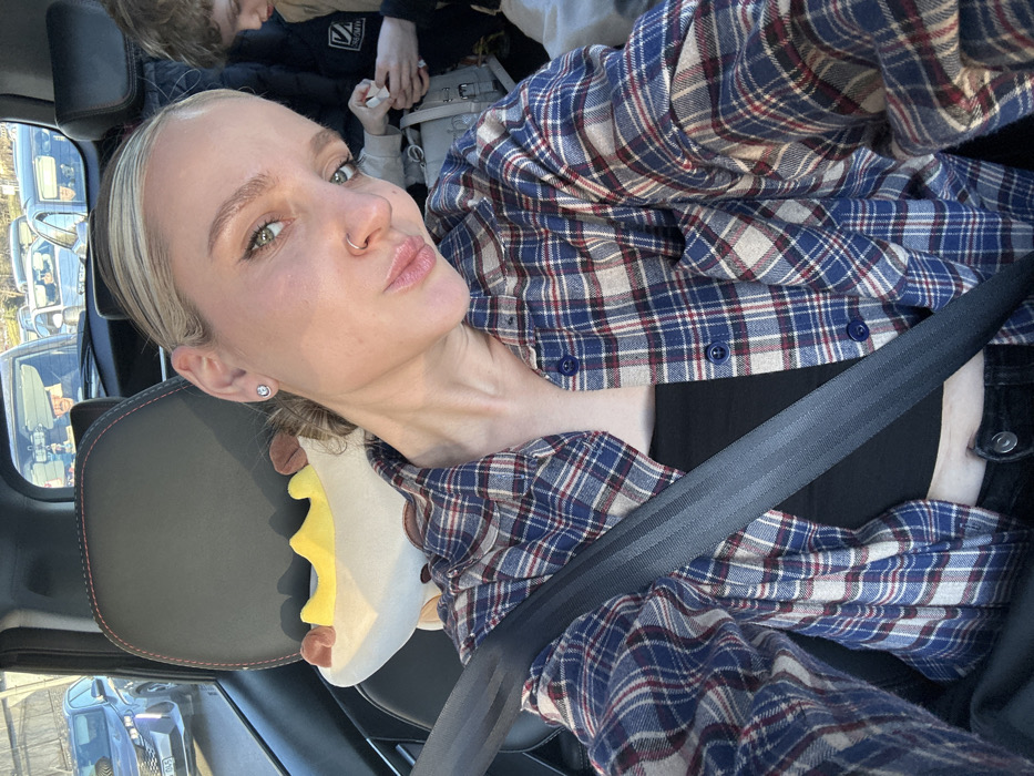 A light-skinned female with blonde hair pulled back and light-colored eyes is seated in the front passenger seat of a vehicle, looking towards the camera with slightly pursed lips