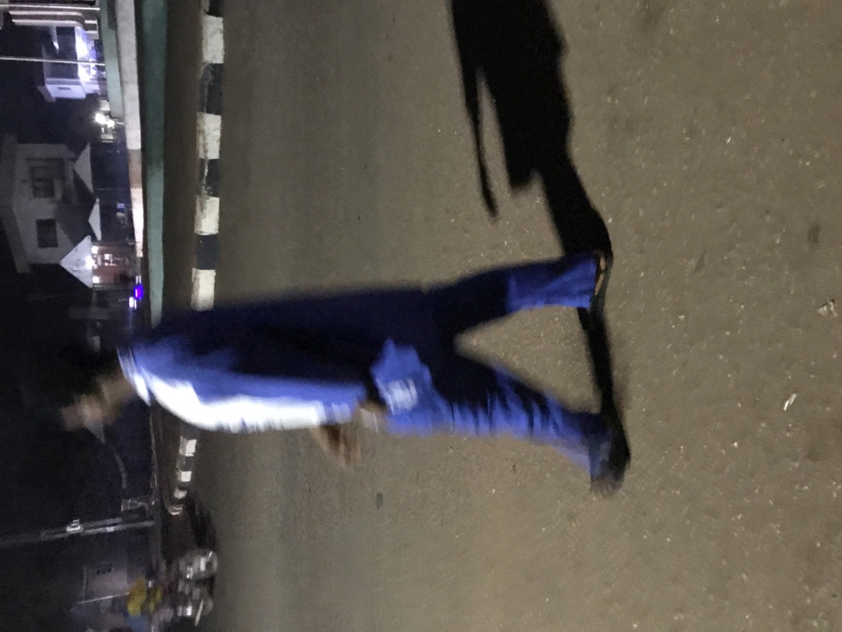 A person in blue sweats with a white stripe is walking. Their shadow is cast long on the ground beside them. In the background are buildings lit up in the dark. A street pole with alternating white and black stripes is visible. The setting appears to be outdoors at night.