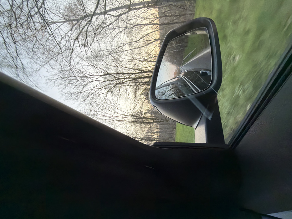 This image depicts a view from the interior of a moving vehicle, captured in the city of Niederanven, Luxembourg, looking towards the front passenger side. The upper left frame is dominated by the dark gray or black interior trim of the vehicle's A-pillar and door frame. Outside the vehicle, and reflected in the side-view mirror, is a rural road flanked by numerous deciduous trees with bare branches, characteristic of winter or early spring conditions. The sky transitions from a pale blue to a warm, light orange or yellow hue, suggesting either sunrise or sunset, with green ground cover visible alongside the road. A black exterior side-view mirror is prominently positioned in the lower right, reflecting the asphalt road extending behind the vehicle. The road is marked by a white solid line on the right shoulder. Faint red lights, indicative of distant vehicle tail lights, are visible in the mirror's reflection, suggesting other traffic. The mirror surface exhibits minor smudges or water droplets. Motion blur is evident on the green vegetation seen through the lower portion of the passenger window, consistent with the vehicle being in motion. No individuals are visible.