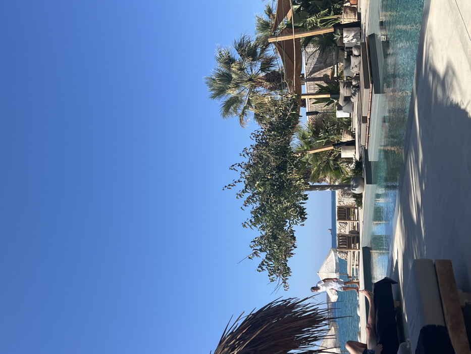 This image depicts an outdoor leisure facility situated on a coastline in Sarakiniko, Greece, under a clear, bright blue sky. In the immediate foreground, to the left, a portion of a thatched parasol is visible. Adjacent to it, a person is reclining on a dark-cushioned sunbed, with only their legs, clad in dark shorts, visible. The midground features a light blue swimming pool surrounded by a light-colored concrete deck. Within the pool, submerged platforms hold grey lounge cushions. To the right of the pool, a shaded lounge area is established under a light brown fabric canopy supported by wooden posts, furnished with multiple grey-cushioned seating units. Various potted plants and several tall palm trees are distributed around the pool and lounge area. A prominent green-leafed tree stands between the pool and the distant sea. Towards the left midground, near the ocean's edge, a man stands barefoot, facing right, wearing a white t-shirt and white patterned shorts. Behind him, two white fabric beach umbrellas are visible on the sand, alongside two wooden benches positioned against a low stone wall. The calm blue sea extends to the horizon, where a small rocky islet is visible in the distance, and a faint, small vessel can be discerned further out.