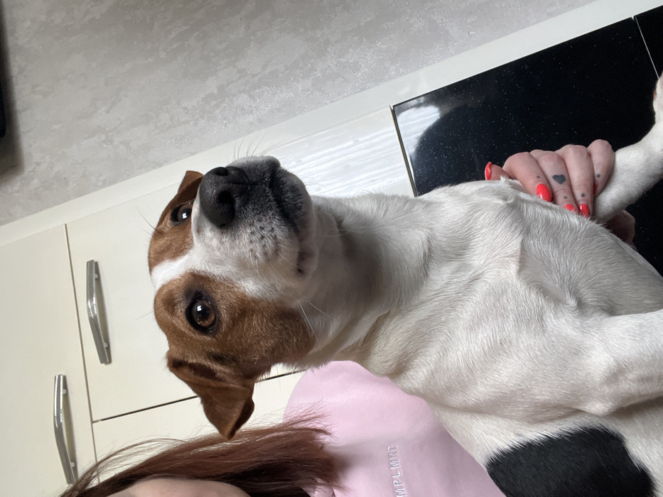 A small, white-bodied dog with brown patches on its head and ears, and a black patch on its left flank, occupies the central foreground, looking upwards and to the right with brown eyes and a black nose. The dog is held by a person, whose right arm, shoulder, and a portion of their reddish-brown hair are visible on the left. The person wears a light pink sweatshirt with partial white embroidered text, "MPLMNТ," on the front. The person's right hand, featuring bright orange-red nail polish and several small, dark tattoos on the knuckles including a heart shape, supports the dog's underside. The background consists of light cream-colored kitchen cabinets with two silver-colored horizontal bar handles on the upper left, transitioning to a textured, light gray wall surface on the upper right. A dark, reflective horizontal surface, possibly a countertop, is visible below the dog, reflecting ambient light or a window. The specific location within the city of Minsk, Belarus, cannot be determined from the visual evidence presented.