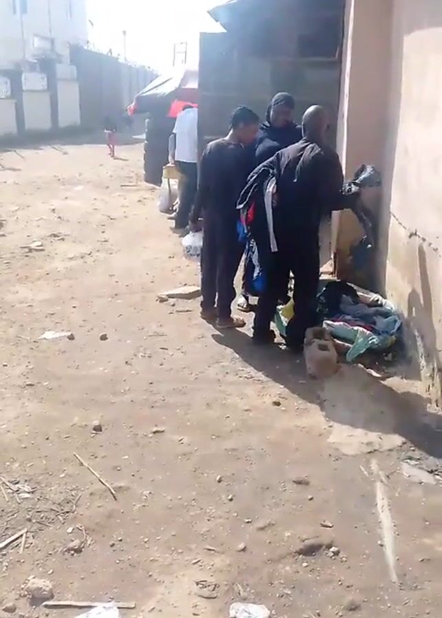 group of four men standing in an alleyway or narrow dirt road next to a wall. One of the men is bending over and appears to be sorting through items or clothing on the ground. There's a backpack on the ground near him. Behind them, farther down the road, there are a few other people standing near what looks like a vendor's stand, possibly under a red umbrella. In the background to the left, there's a building with a white facade and a dark roof. The ground is dirt-covered and strewn with litter, including what appears to be paper and small sticks. A child can be seen walking away in the background. The day is bright, with a strong sunlight casting shadows.