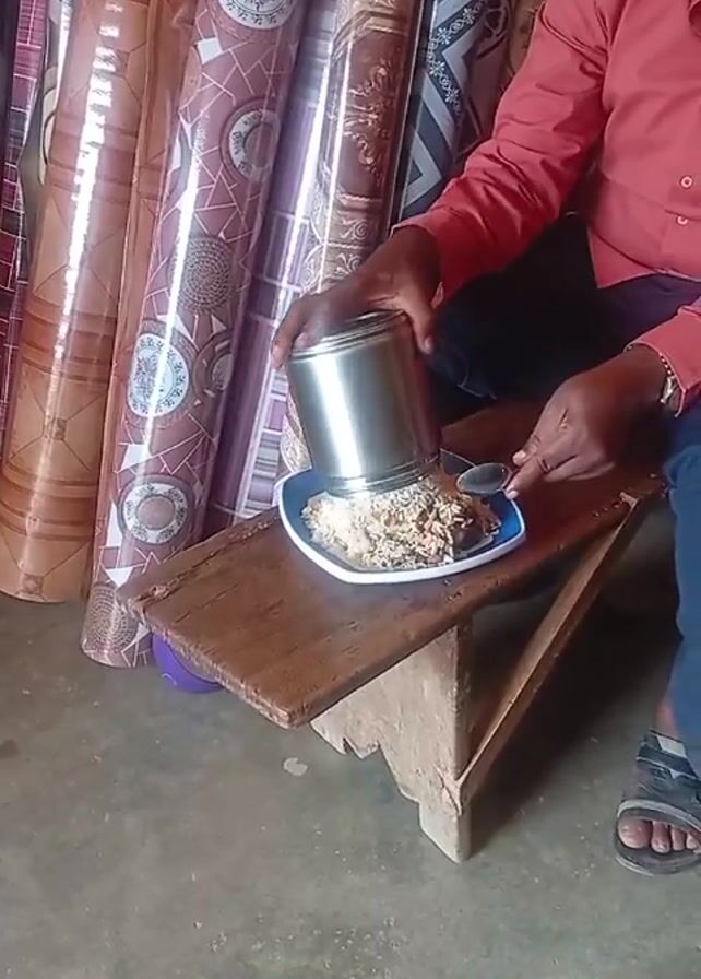 A person wearing a red shirt, dark pants, and sandals is sitting on a wooden stool. In front of them on the stool is a blue-rimmed plate containing food. They are holding a silver metal container over the plate, seemingly adding something to the food. A spoon rests next to the container on the plate. Behind the person are several rolls of floor coverings, or linoleum, stacked upright. The rolls have varying patterns and colors. The floor appears to be concrete.
