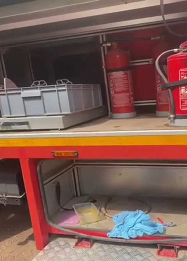 open storage compartment of a fire truck. Inside, there are several red fire extinguishers, a gray plastic storage bin on a sliding tray, and smaller compartment below containing miscellaneous items including a blue cloth and small plastic container. The truck is red with a yellow reflective stripe. The ground is dry and dusty. There is no one visible in the video. The camera slowly pans from left to right within the compartment.