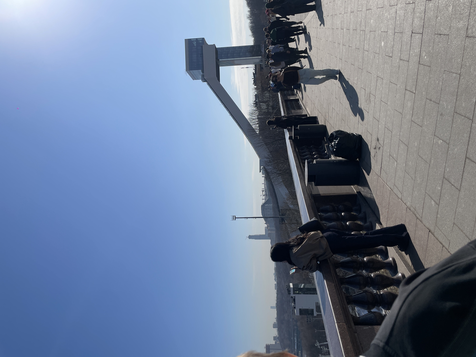 view from an elevated platform in Moscow, Russia. The platform is lined with a decorative railing, and people are present, looking out at the city. A prominent structure is the ski jump on Sparrow Hills (Vorobyovy Gory). In the foreground, individuals are leaning against the railing, seemingly observing the cityscape. Further along the platform, a group of people is walking. Bags and personal belongings are placed near the railing. The sky is clear and blue, suggesting a sunny day. The city of Moscow is visible in the background, with various buildings and greenery.