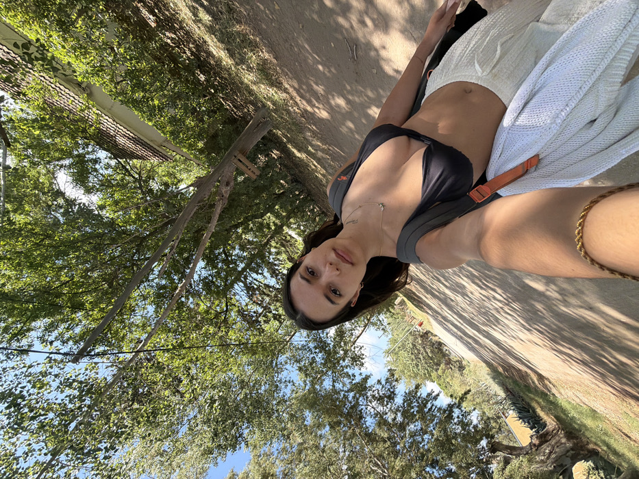 A female individual is depicted in an outdoor selfie taken on a clear, sunny day in Reta, Argentina. She stands on an unpaved path or dirt road, holding the camera with her extended right arm, which bears a gold-colored twisted bracelet. She wears a black bikini top and white, textured loose-fitting pants. A grey backpack with an orange buckle accent is on her back, and a light-colored knitted garment hangs from the backpack strap on her left side. A delicate gold-colored necklace with a small charm is visible around her neck. She maintains a neutral expression while looking directly into the camera. The background features abundant green foliage and trees under a blue sky. To the left, the dirt road is visible with tree shadows, lined by green vegetation including what appear to be agave plants, and a distant utility pole marked with red and white stripes. To the right, dense green trees partially obscure a building with a reddish-brown tiled roof, and a small wooden structure is affixed to a tree trunk.