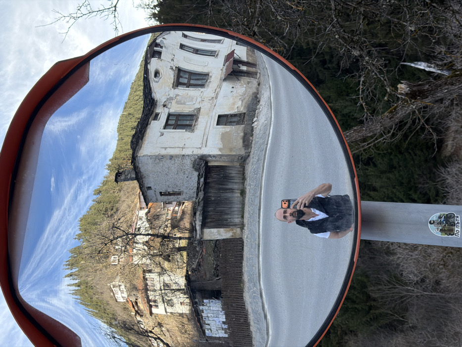 A convex traffic mirror with an orange frame captures a distorted wide-angle view of a scene in Shiroka Laka, Bulgaria