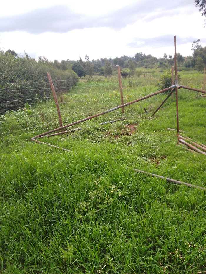 The image depicts a rural field in Ndeiya, Kenya, under an overcast sky. The foreground and mid-ground consist of vibrant green grass and various weeds, with visible patches of reddish-brown earth. A partially dismantled or collapsed structure made of interconnected and loose galvanized steel pipes is scattered across the mid-ground. Some pipes are bent, some form an upright, angular frame, and others lie horizontally on the ground. To the left, a fence line is visible, comprising several vertical wooden posts strung with multiple horizontal wires. Dense green foliage, shrubs, and trees define the background. No people are present.