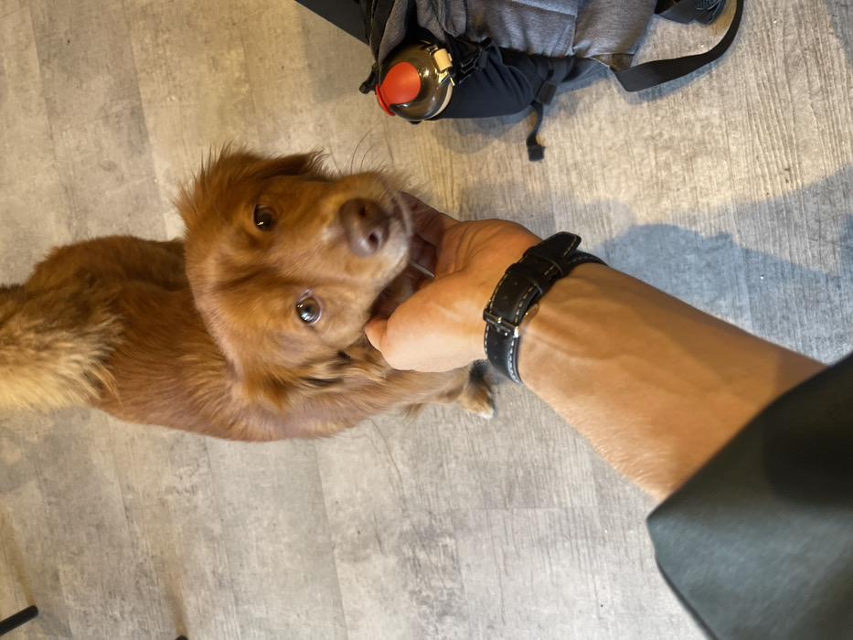 - "A person's arm, adorned with a black leather watch, is holding the head of a medium-sized, brown dog" by FM-20Xdy2, licensed under CC BY 4.0